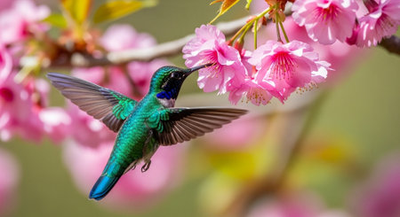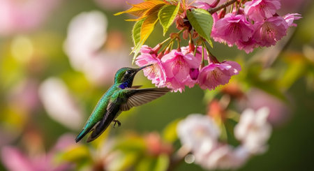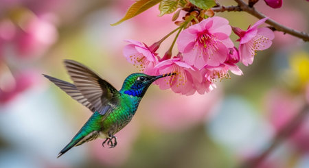 Vibrant hummingbird drinking nectar from cherry blossom flower