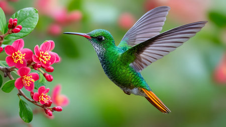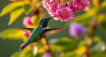 Vibrant hummingbird feeding on a beautiful pink fuchsia flower