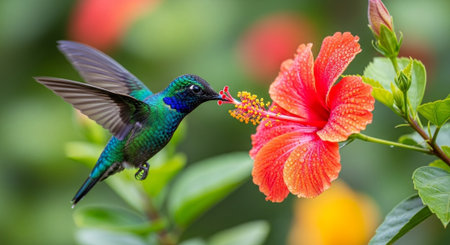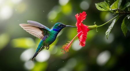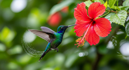 Hummingbird feeding on vibrant red hibiscus flower in nature