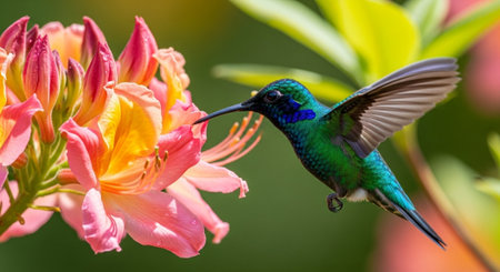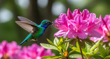 Vibrant hummingbird feeding on nectar from colorful azalea flower