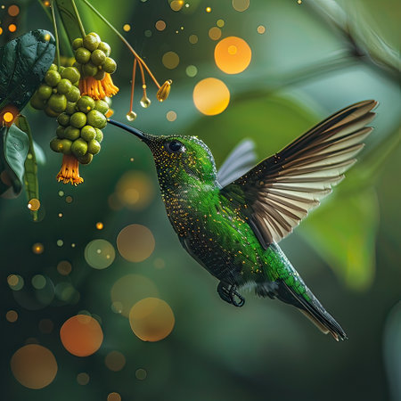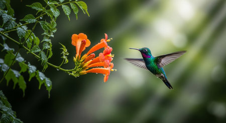 Hummingbird feeding on vibrant honeysuckle flower in a garden