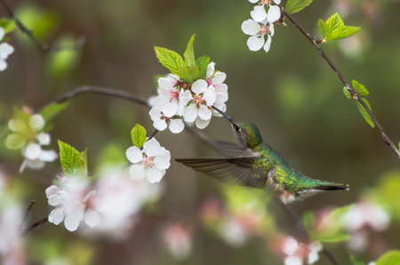 Hummingbird feeding on nectar from blooming cherry blossoms