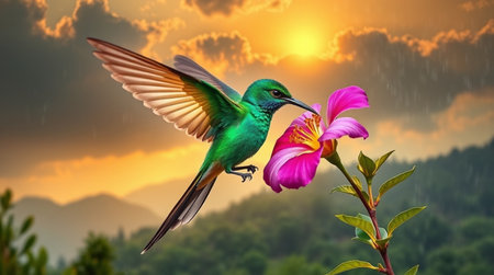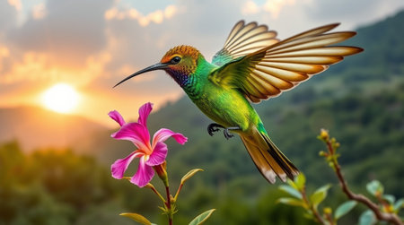 Hummingbird with beautiful pink flower on the background of mountains at sunset