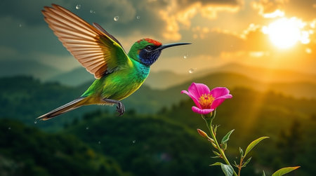 Hummingbird flying in the forest with red flower and sunlight in the background