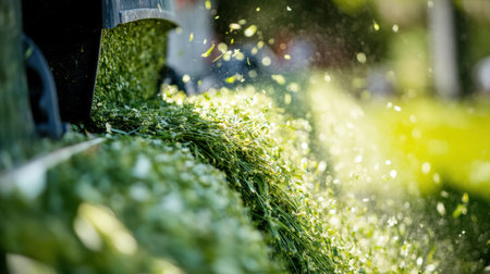 A close-up view of freshly cut grass being ejected from a lawn mower, highlighting the vibrant green color and the motion of grass particles in sunlight.