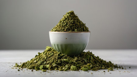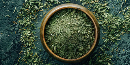 AI Generated. Dried tarragon fills a wooden bowl viewed from above