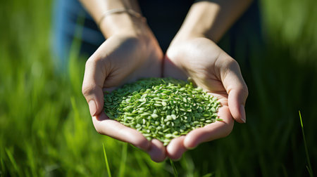 Close-up of hands cupping green plastic polymer pellets, symbolizing raw materials for manufacturing. Background features scattered pellets, emphasizing industrial production.