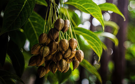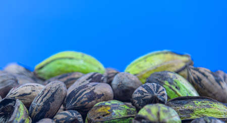 Pecan or pecan (Carya illinoinensis) fruits. Exotic fruit. Nuts. Exotic food. Pecan almonds. The word Pecan means Nut that needs a stone to break.