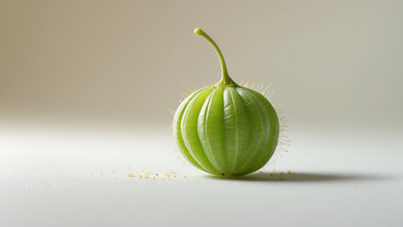 Delicate green fruit resting on a smooth surface with soft lighting highlighting its texture and shape