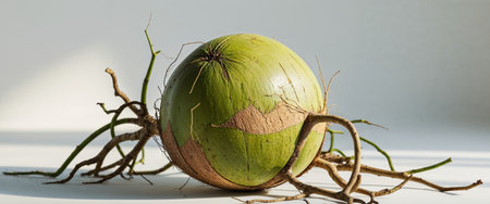 AI Generated. Fresh green coconut with rough texture and roots