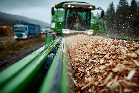 Wood Processing in Action: Industrial Machinery Transporting Freshly Chipped Wood on a Misty Day Generative AI