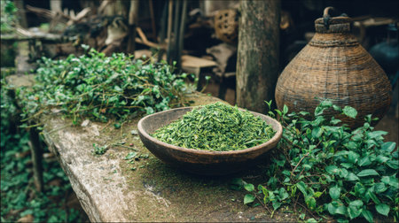 A beautiful display of freshly harvested green herbs in a rustic bowl, placed on a weathered wooden table surrounded by vibrant greenery.