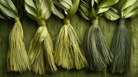 A collection of vibrant green decorative tassels made from natural fibers, perfect for enhancing craft projects or adding elegance to home decor.