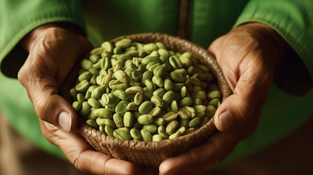 Man holding raw green coffee beans Generative AI