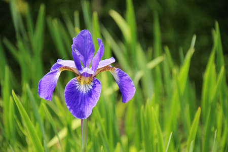 Iris flower on a background of green tall grass. Close-up. Bright summer background.