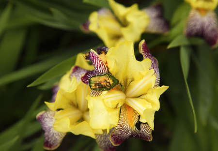Decorative iris flower of yellow color in the garden.