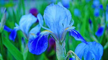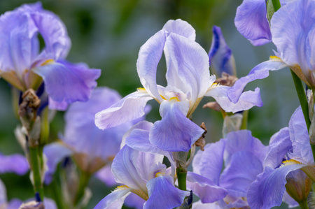 Lilac blue iris flowers, spring blossom of colorful irises in Provence, South of France, nature garden background