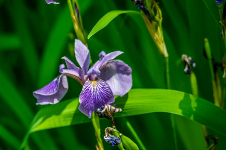 Northern Blue Flag Iris (Iris Versicolor) in a blurred background of green leaves and stalks. They are also known as harlequin blueflag, and poison flag.-01