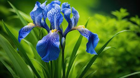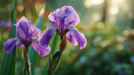 Beautiful blooming irises in a vibrant garden. A serene moment captured in nature with delicate irises swaying gently in the breeze. The elegance of irises symbolizing renewal in the cycle of life.