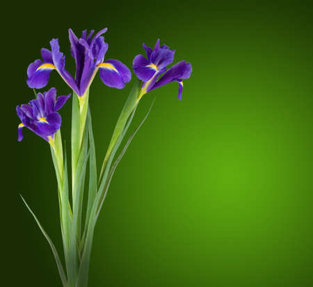 A top view of iris flowers on a green background
