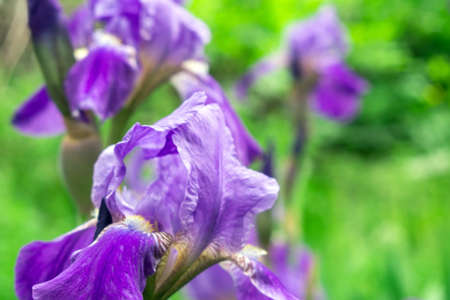 Summer purple violet iris flowers close up view natural background