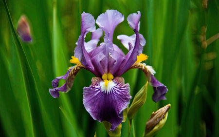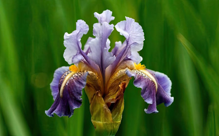 Purple iris flower with yellow stamens on green background