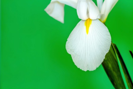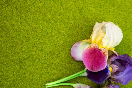 Iris flower on a green background empty space for your text, top view
