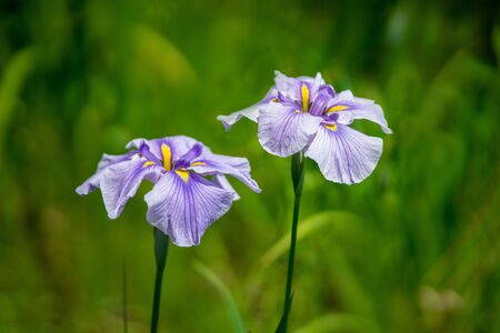 Close up of purple japanese iris flowers in summer garden. Spring nature. Romantic background