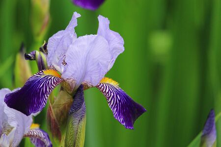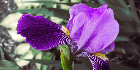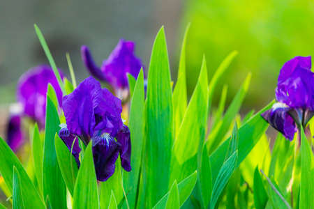 Beautiful purple iris flowers grow in the garden. Close-up of iris flower on blurred green natural background. Full Bloom trend. Shallow depth of field.