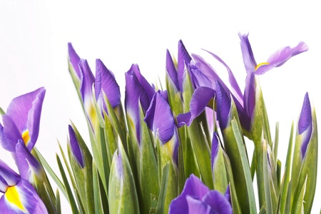 Beautiful violet iris flowers on a white background. Minimalist floral composition.