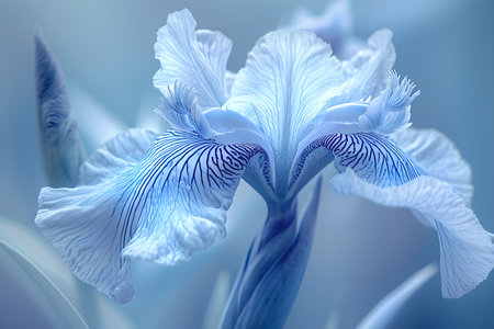 A stunning close-up of a blue iris flower adorned with dew drops, capturing the elegance of nature in soft light. Perfect for floral-themed projects.