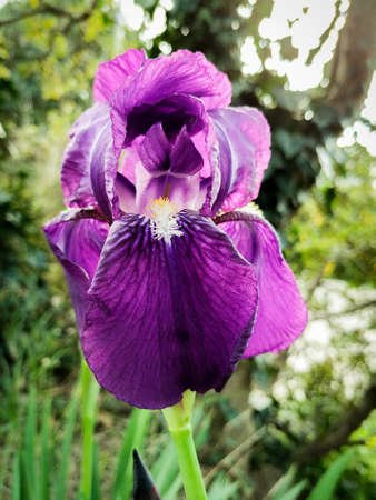 Pretty blooming violet iris flower in the garden.