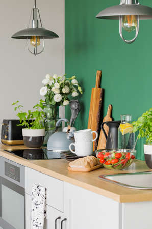 Bread and vegetable salad on wooden counter of trendy kitchen