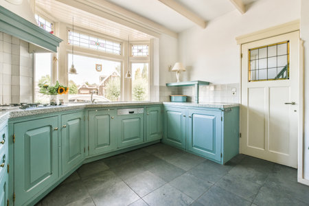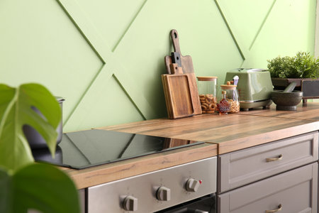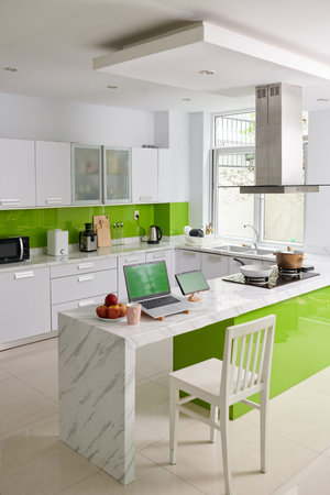 interior of modern kitchen with green tiled walls, green countertops