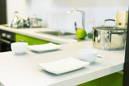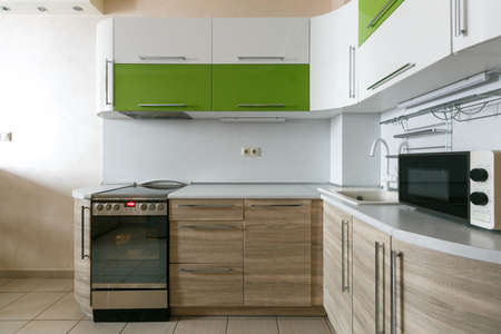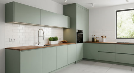 Modern kitchen interior with green cabinet and white countertop.
