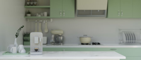 White marble tabletop with coffee machine or coffee maker, coffee cups and copy space for product display over blurred modern pastel green kitchen interior style. 3d render, 3d illustration
