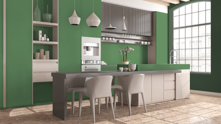 Modern kitchen with island in vintage apartment in beige and green tones with big windows, dining table with chairs, pendant lamps. Classic parquet, wooden roof beams, interior design