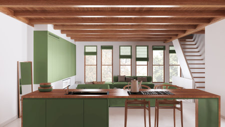 Minimal modern wooden kitchen and dining room, living room with sofa and staircase in white and green tones. Resin floor and beams ceiling. Luxury interior design