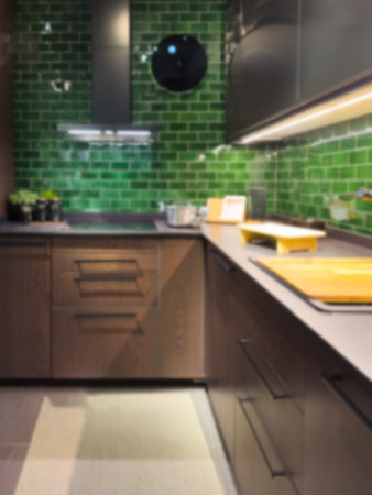 Blurred Background of home Kitchen with Light Bokeh.