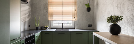Panorama of spacious and modern kitchen with green cupboards and drawers, black countertops and window with wooden blinds