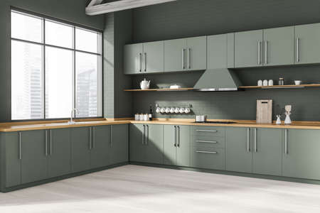 Corner of stylish kitchen with gray brick walls, wooden floor, gray and wooden cupboards and countertops with built in sink and cooker. Window with blurry cityscape. 3d rendering