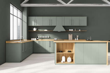 Interior of stylish kitchen with gray brick walls, wooden floor, gray and wooden cupboards, island and countertops with built in sink and cooker. Window with blurry cityscape. 3d rendering
