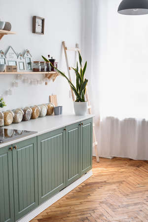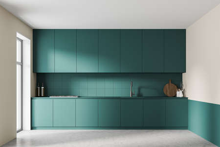 Green modern kitchen interior near tall window. Wooden parquet floor. Empty room no people. 3d rendering
