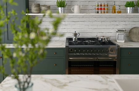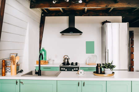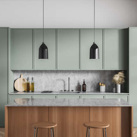 Kitchen in green design with modern appliances and a marble countertop in a cozy modern house