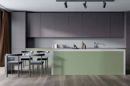 Modern kitchen interior, kitchen room with a table in the middle in green brown.