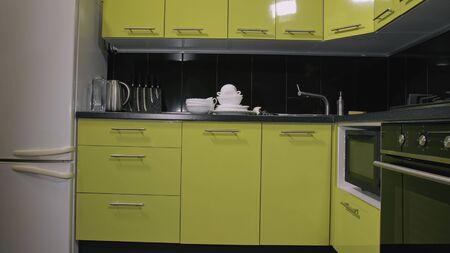 Dirty dishes lying on the table. Automatic electric dishwasher. Stylish modern Built In Kitchen Appliances in green and black color. Empty kitchen nobody.