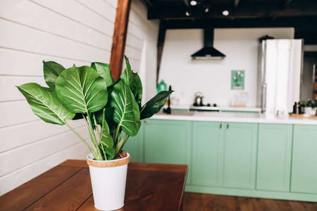 Modern kitchen design in mint color. In the foreground a large domestic plant
