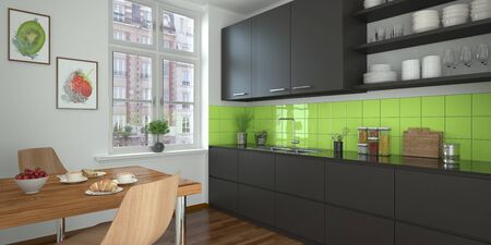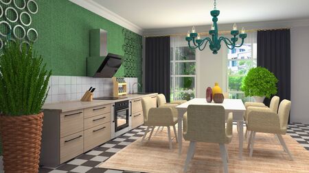 3d Illustration of green modern kitchen in a house with a beautiful design