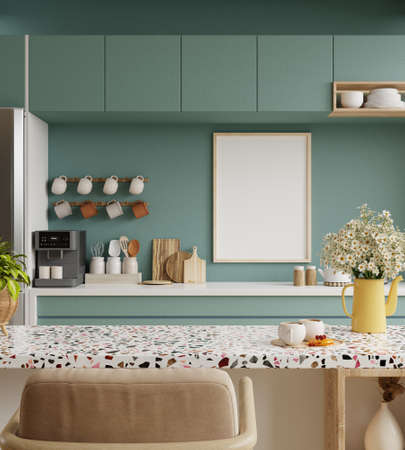 Mock up poster frame in kitchen interior with green wall background.3D rendering