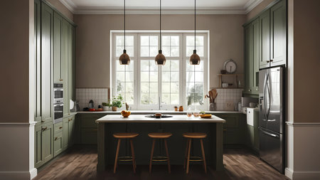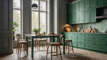 cozy and vibrant green kitchen featuring wooden accents, a rustic dining table, and large windows letting in natural light. The inviting space showcases a blend of modern and classic design elements, perfect for a warm home.